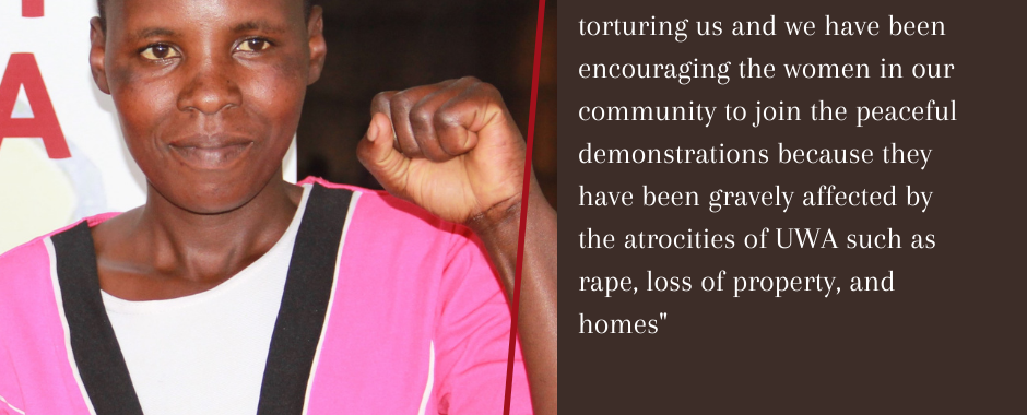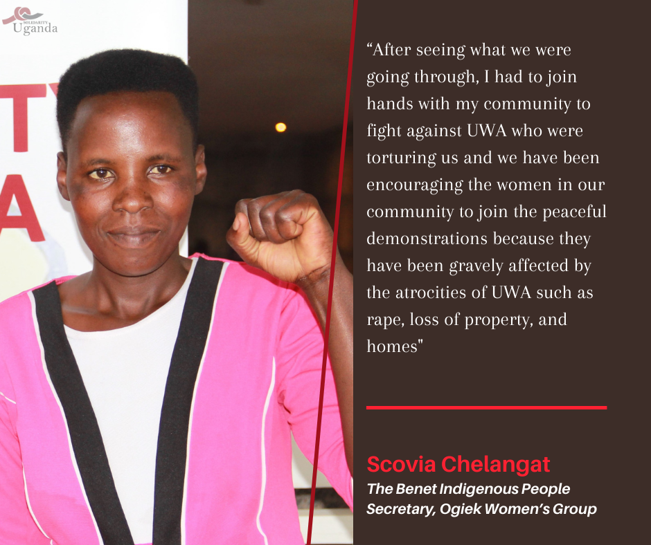 In Scovia’s words, “After seeing what we were going through, I had to join hands with my community to fight against UWA who were torturing us and we have been encouraging the women in our community to join the peaceful demonstrations because they have been gravely affected by the atrocities of the UWA such as rape, loss of property, and homes”. She also adds that through training and mentorship from Solidarity Uganda, they have been empowered as a community to speak up about their matters and strategically used non-violent tactics to wage against injustices.