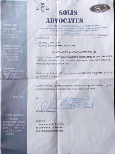 Early last week, a court letter delivered to the farmers by Bukenya through his lawyers, ordered the farmers to vacant by 30th June.